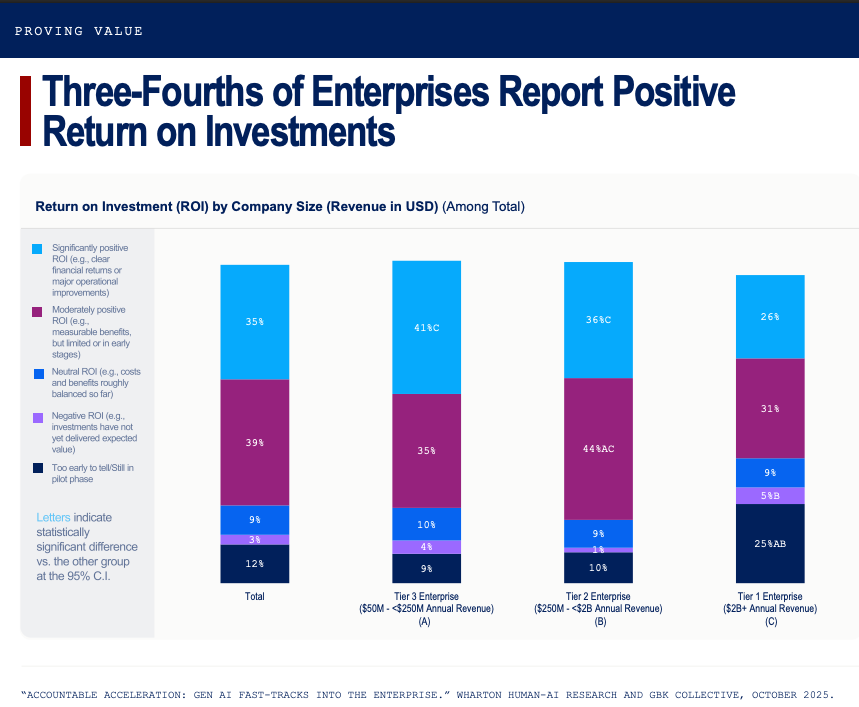 A widely referenced MIT study suggests that only around 5% of GenAI projects were considered successful, while a McKinsey 2025 state of AI survey found 88% of companies are now using AI in at least one function. A recent study from Wharton and GBK Collective added more optimism to the mix, finding that three-fourths of enterprises report positive ROI on their GenAI investments. Most of the respondents in the Wharton study (88%) say they’ll increase spending in the next 12 months, which is perhaps the biggest sign that companies are beginning to see results.