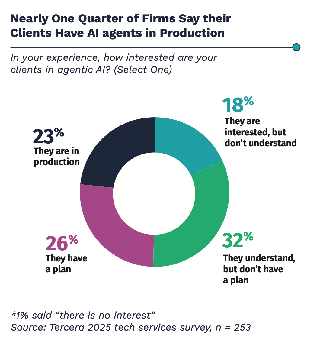In 2025, the AI narrative pivoted rapidly to agents. Every software vendor in our 2025 Tercera 30 has announced investment or offerings here, and it’s on the agenda for their customers and partners as well. A Tercera survey of 320+ services leaders this summer indicates that more than a quarter of IT services firms now have clients with AI agents in production.