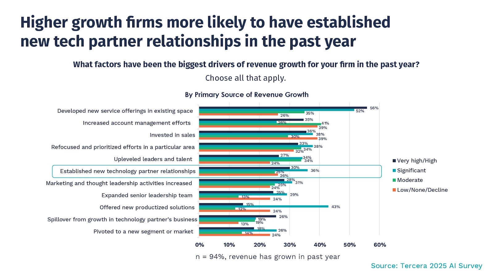 Tercera survey data backs this up. In a 2024 survey of IT service leaders, firms reported maintaining 3-6 partner relationships, with larger firms naturally carrying wider portfolios. In our 2025 survey, 70% said they had grown their partnerships over the past 12 months — 55% slightly and 15% significantly. High-growth firms pushed even harder: 82% expanded their partner ecosystems, and they were over two times more likely to grow partnerships “significantly.”
