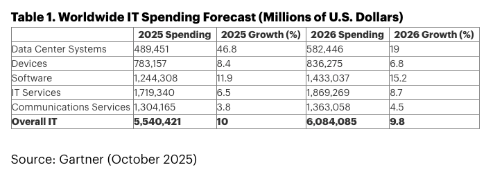 The services sector did see growth in 2025, but not uniformly. According to Gartner, year-over-year (YoY) growth in worldwide IT services spending remained well below the highs of 2021 and 2022, and is expected to land around 6.5% YoY for 2025. Certain segments such as data and AI grew faster, while other segments like commerce and digital engineering services saw greater headwinds.