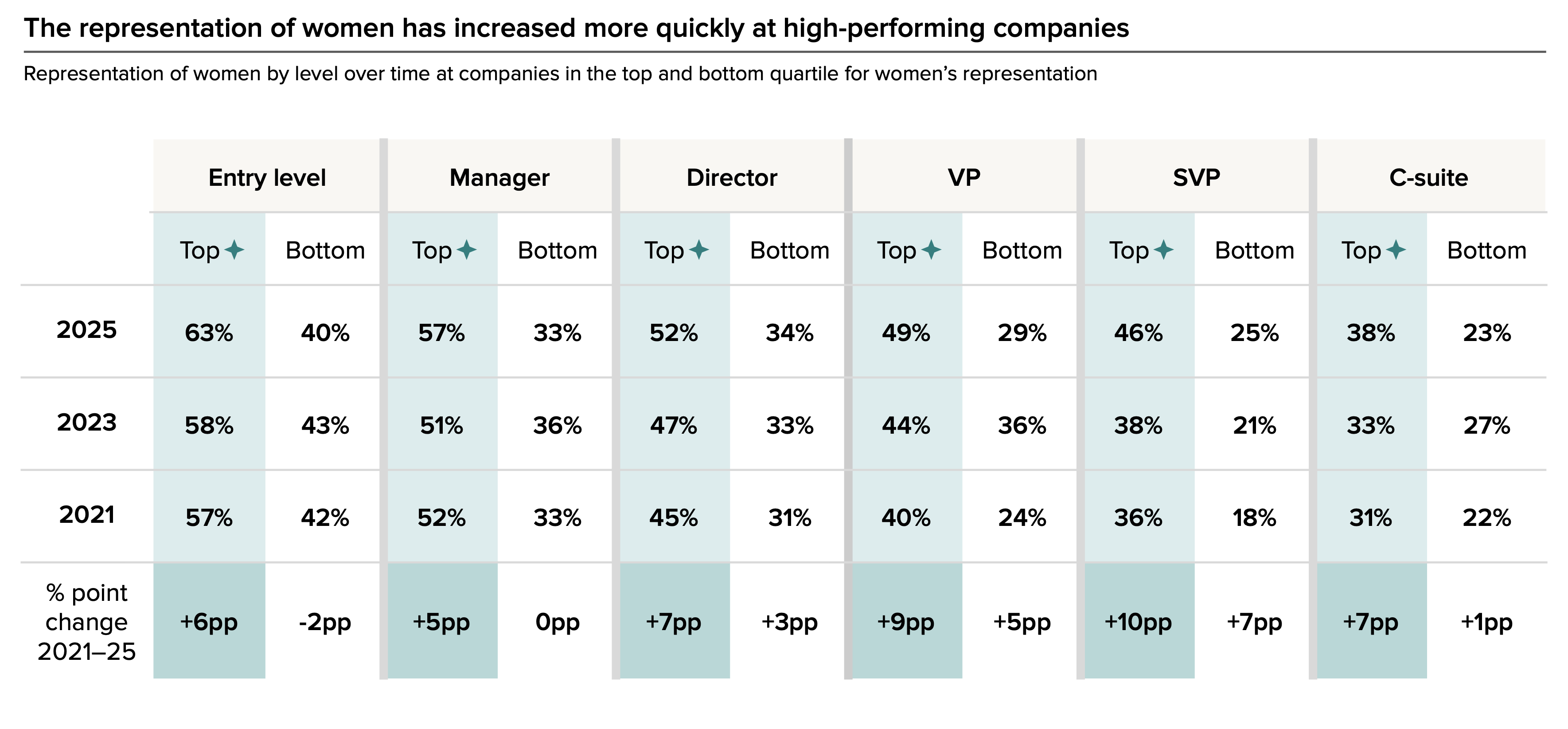 According to McKinsey’s most recent Women in the Workplace report, women continue to be underrepresented at every level of the corporate world, especially in the most senior roles. Less than 30% of C-suite roles are held by women. The good news is that those numbers have increased slightly over the last year. Interestingly, the companies with the largest increases are also the highest-performing.