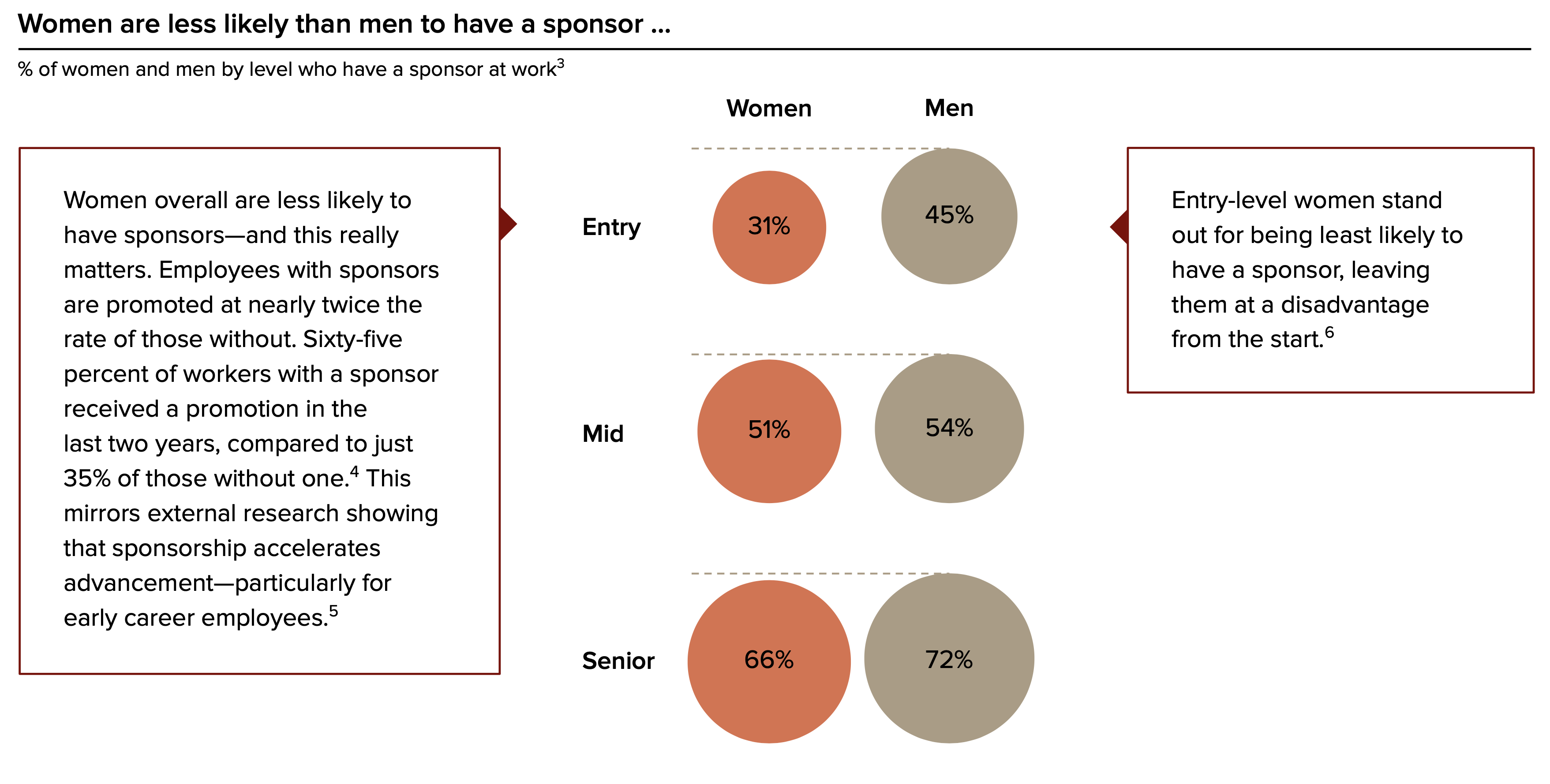 According to many female leaders we’ve spoken to, sponsorship has been vital to their success. McKinsey’s research reinforces this, showing that employees with sponsors are promoted at nearly twice the rate of those without a sponsor. Unfortunately, women are less likely than men to have a sponsor and to be offered career and leadership training, especially at senior levels.