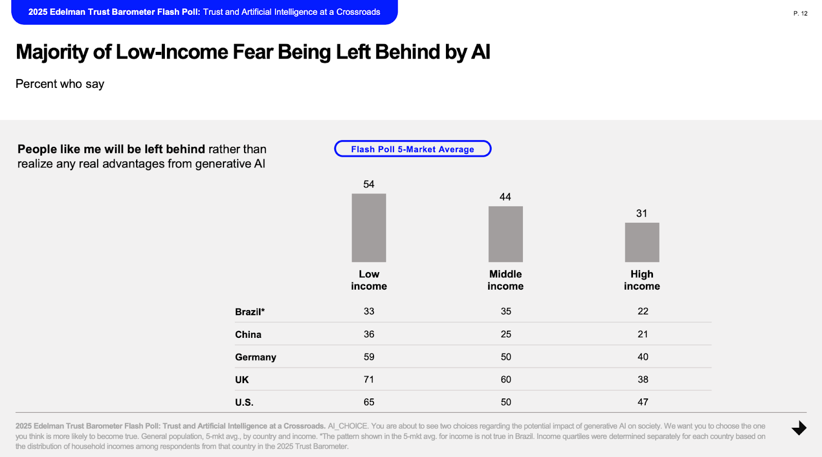Employees are being pushed to adopt AI to automate aspects of their jobs and move faster, while at the same time reading about waves of layoffs driven by that same automation. It’s happening across every industry, but not surprisingly, impacting certain parts of the workforce more. About half of low- and middle-income respondents in Edelman’s trust survey say they fear that AI will leave people like them behind.